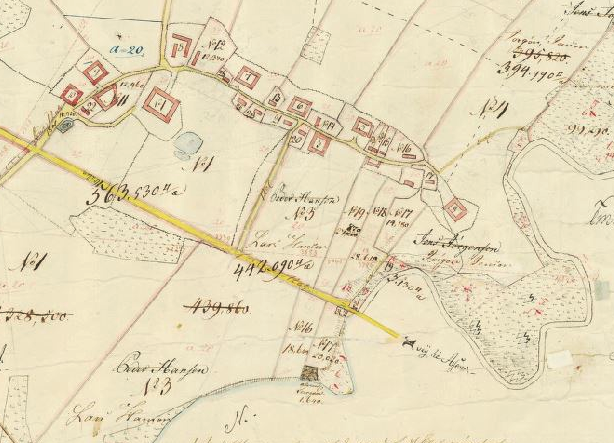 | Udsnit af matrikelkort for Husby 1810-16. Det er lige efter gårdes jorder er blevet samlet, men der er fortsat ikke sket udflytning af de gårde, der havde fået jord længst væk fra landsbyen |